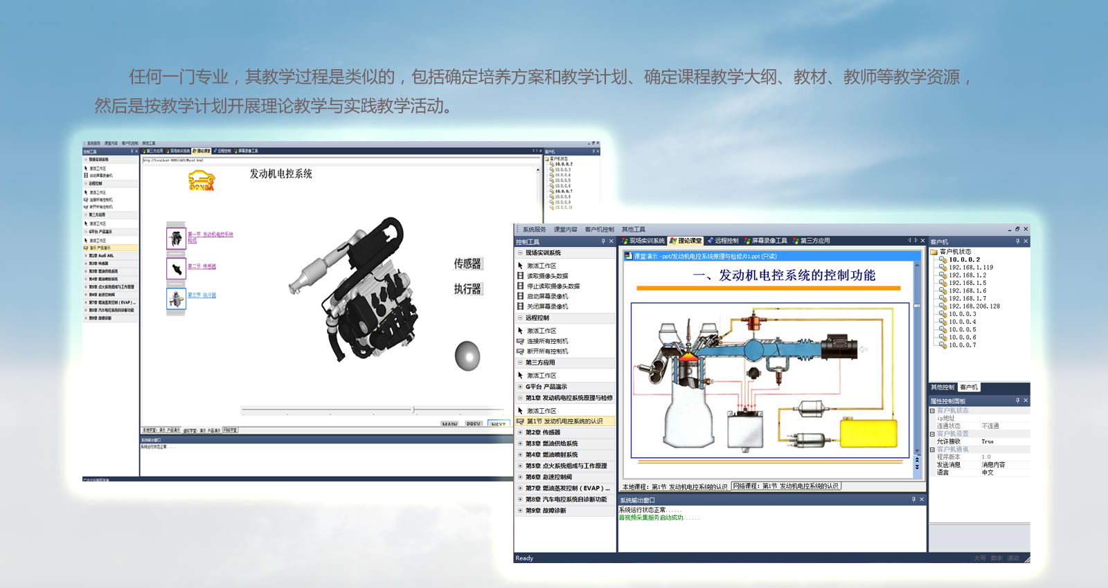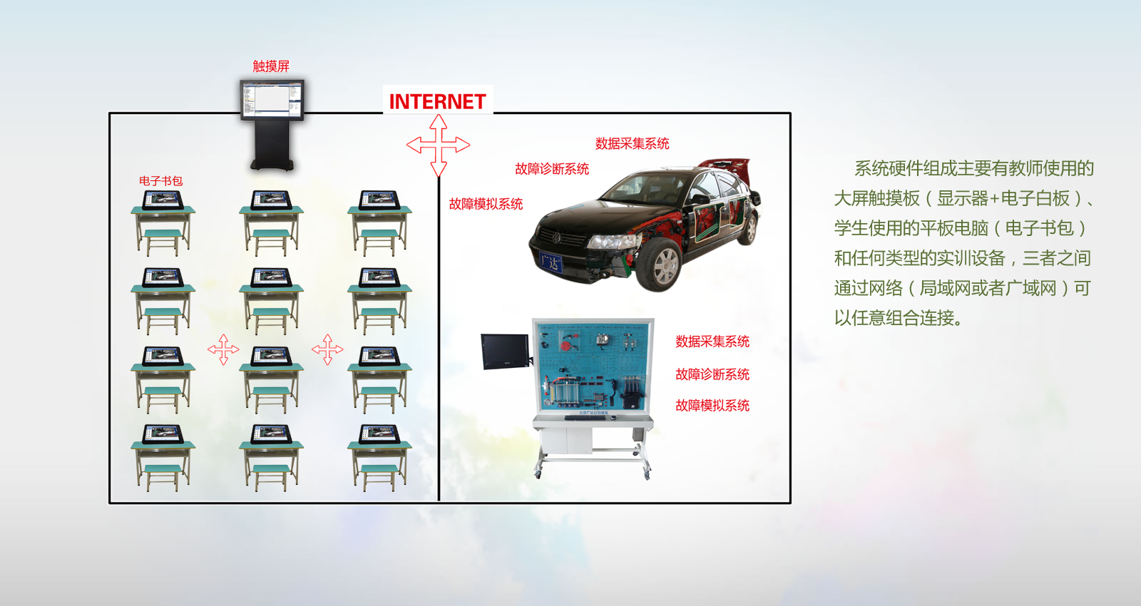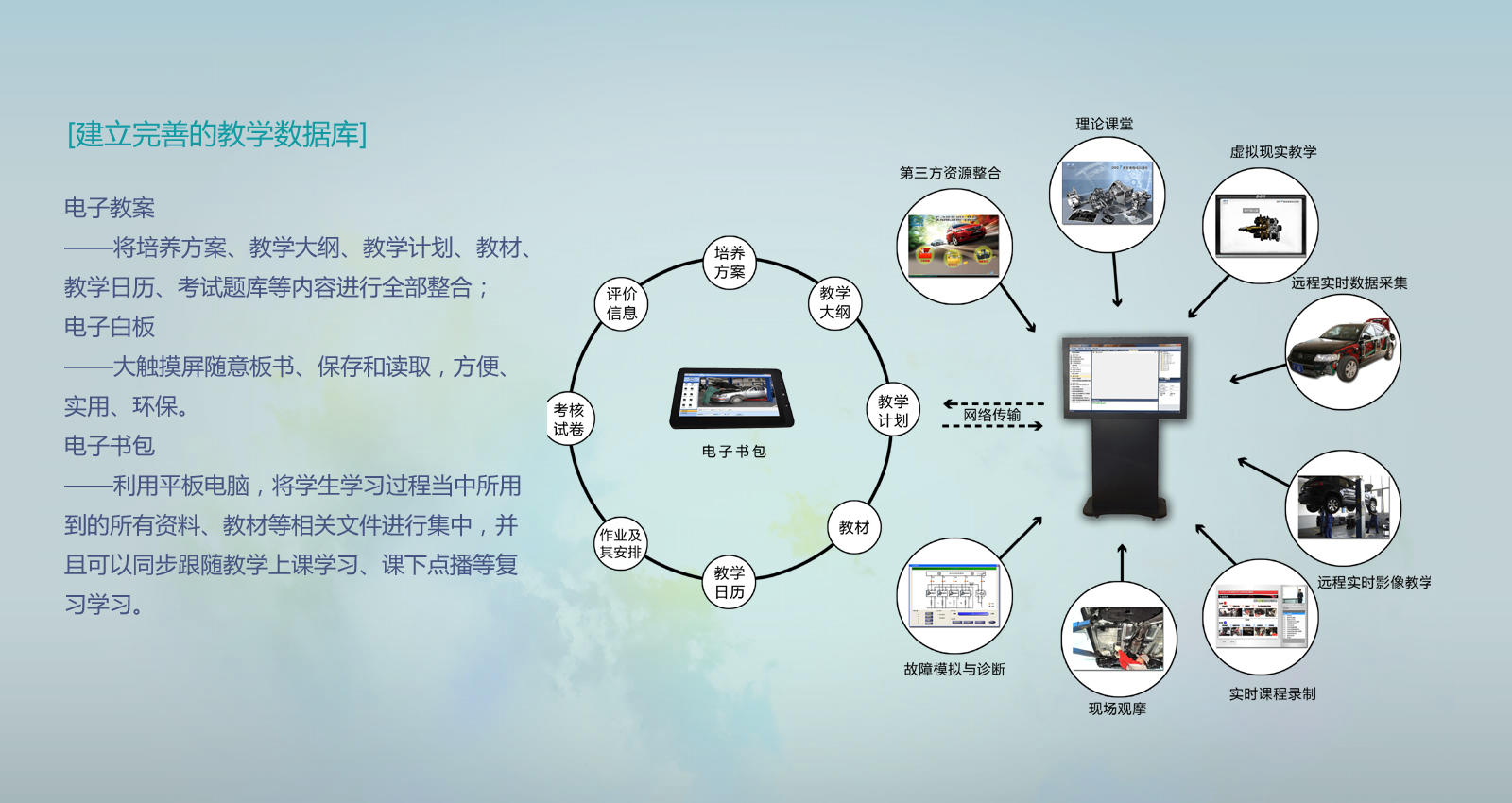 如何實現(xiàn)教學(xué)過程信息化?我們一直在探討。在過去的市場調(diào)查中,我們發(fā)現(xiàn),能夠用于信息化教學(xué)的手段很多。如網(wǎng)絡(luò)技術(shù)、仿真軟件技術(shù)、影音傳輸技術(shù)、物聯(lián)網(wǎng)技術(shù)、電子書包技術(shù)、二維、三維圖像技術(shù),但現(xiàn)有的這些技術(shù)又都是零散的,不能完全在一個平臺調(diào)用的。而我們在教學(xué)過程中需要與學(xué)生的教學(xué)互動與管理;需要調(diào)用與講課內(nèi)容相關(guān)的輔助軟件;需要調(diào)用實訓(xùn)設(shè)備或儀器來驗證某原理波形及檢測方法;在實際拆裝及檢測過程中實際教給學(xué)生標(biāo)準(zhǔn)的工作流程及設(shè)備使用程序。針對衛(wèi)星學(xué)校的合作需求需要進(jìn)行遠(yuǎn)程師資培訓(xùn),等等。這些,目前我們老師使用的教學(xué)手段是達(dá)不到的。