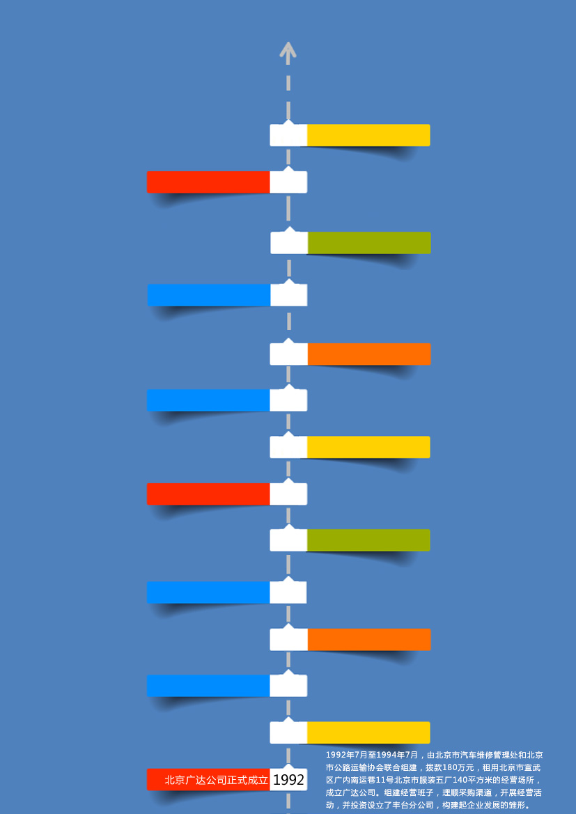1992年7月至1994年7月,由北京市汽車維修管理處和北京市公路運輸協(xié)會聯(lián)合組建,撥款180萬元,租用北京市宣武區(qū)廣內(nèi)南運巷11號北京市服裝五廠140平方米的經(jīng)營場所,成立廣達公司。組建經(jīng)營班子,理順采購渠道,開展經(jīng)營活動,并投資設立了豐臺分公司,構(gòu)建起企業(yè)發(fā)展的雛形。