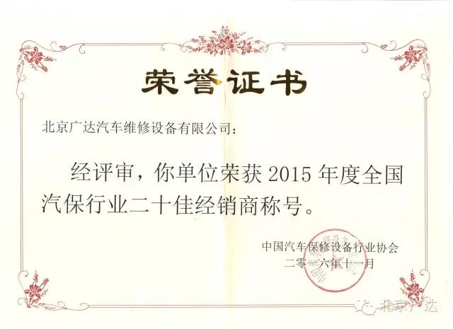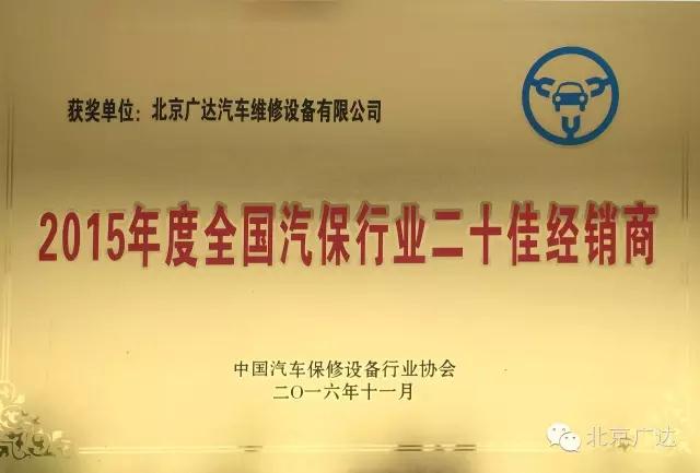 北京廣達(dá)榮獲2015年度全國(guó)汽保行業(yè)20佳經(jīng)銷商稱