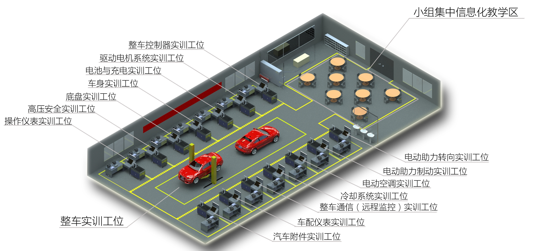 流水線型BEV實訓(xùn)系統(tǒng)(Flow Lined Vocational PracticeSystem of BEV)簡稱FLVPS,由總計13個實訓(xùn)工位構(gòu)成。FLVPS系統(tǒng)構(gòu)成了職業(yè)教育及應(yīng)用型本科教育新能源電動汽車技術(shù)專業(yè)或車輛工程類專業(yè)新能源汽車技術(shù)方向的綜合實訓(xùn)所需手段的綜合解決方案,為學(xué)校提供實訓(xùn)所需軟件硬件一體化的系統(tǒng)完整的教育技術(shù)平臺。系統(tǒng)按德國行動導(dǎo)向的職業(yè)教育思想和理念開發(fā)設(shè)計,支撐以項目教學(xué)方法為主、引導(dǎo)文、案例和角色扮演為輔的行動導(dǎo)向教學(xué)方法,突出“做中學(xué)”和“學(xué)中做”,不是在現(xiàn)成設(shè)備上學(xué)習(xí),而是在做設(shè)備的過程中學(xué)習(xí)。系統(tǒng)依據(jù)電動汽車維修職業(yè)行動領(lǐng)域決定的對知識和技能的需求,支持開展構(gòu)造認(rèn)知、原理研討、拆裝操作、運行操作、檢測操作、維修操作、保險定損評定等實訓(xùn)的開展。