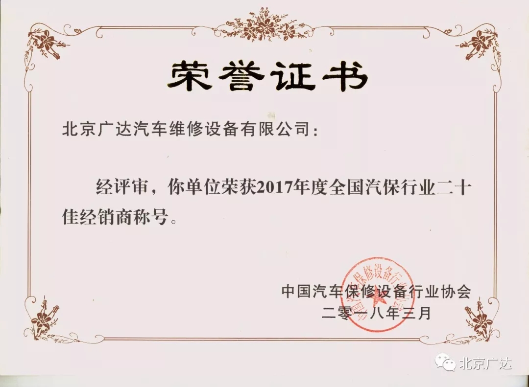 北京廣達(dá)蟬聯(lián)“2017年度全國汽保行業(yè)二十佳經(jīng)銷
